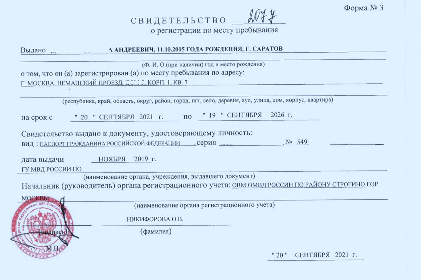 Свидетельство о регистрации по месту пребывания, оформляется по форме №3, напечатано в формате А5 (половинка листа А4) или в формате А4 (целый лист).